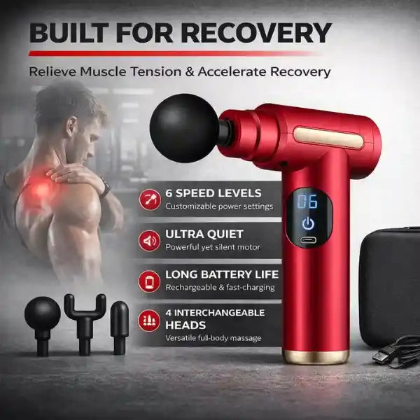 Compact and lightweight with multiple speed levels, interchangeable heads, and a quiet rechargeable motor, it delivers powerful performance wherever you go — home, gym, office, or travel.